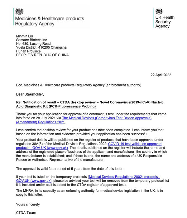 新冠检测试剂在英国上市必须经过CTDA审查和MHRA注册双认证,由于CTDA审查对产品性能的高要求,目前可在英国合法销售的新冠产品并不多。东升国际官网生物新型冠状病毒(2019-nCoV)核酸检测试剂盒(荧光PCR法)临床性能和分析性能均满足CTDA高要求,且得到进一步有效验证,获得了CTDA的充分认可。